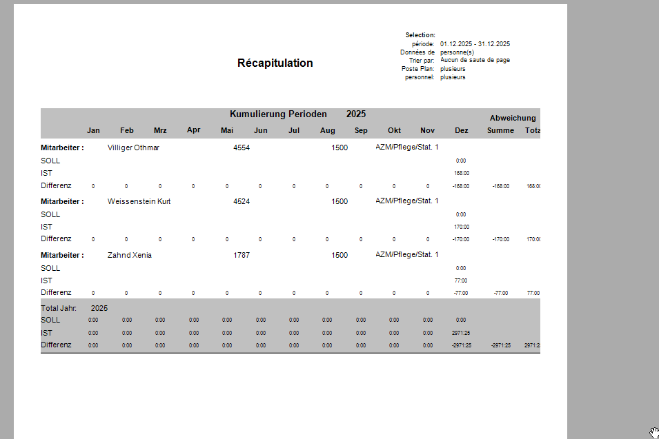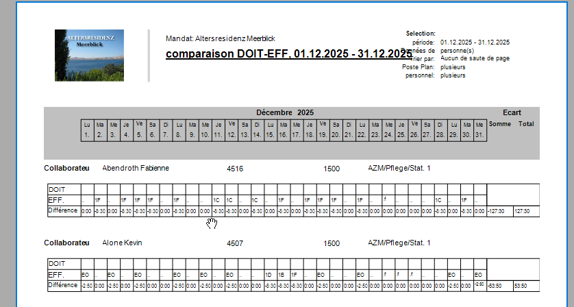 Chaque mois, le total des employés sélectionnés est calculé pour chaque jour pour les valeurs THÉORIQUES et RÉELLES, ainsi que la différence. L'écart est également indiqué sous forme de somme et de total.