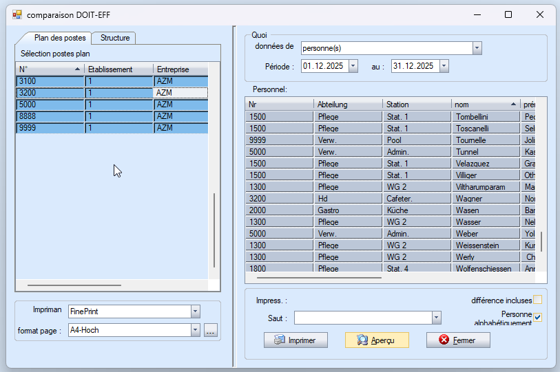 Le rapport indique les symboles théoriques et réels pour chaque employé, et la différence entre ces deux valeurs est indiquée dans la troisième ligne « Différence ».