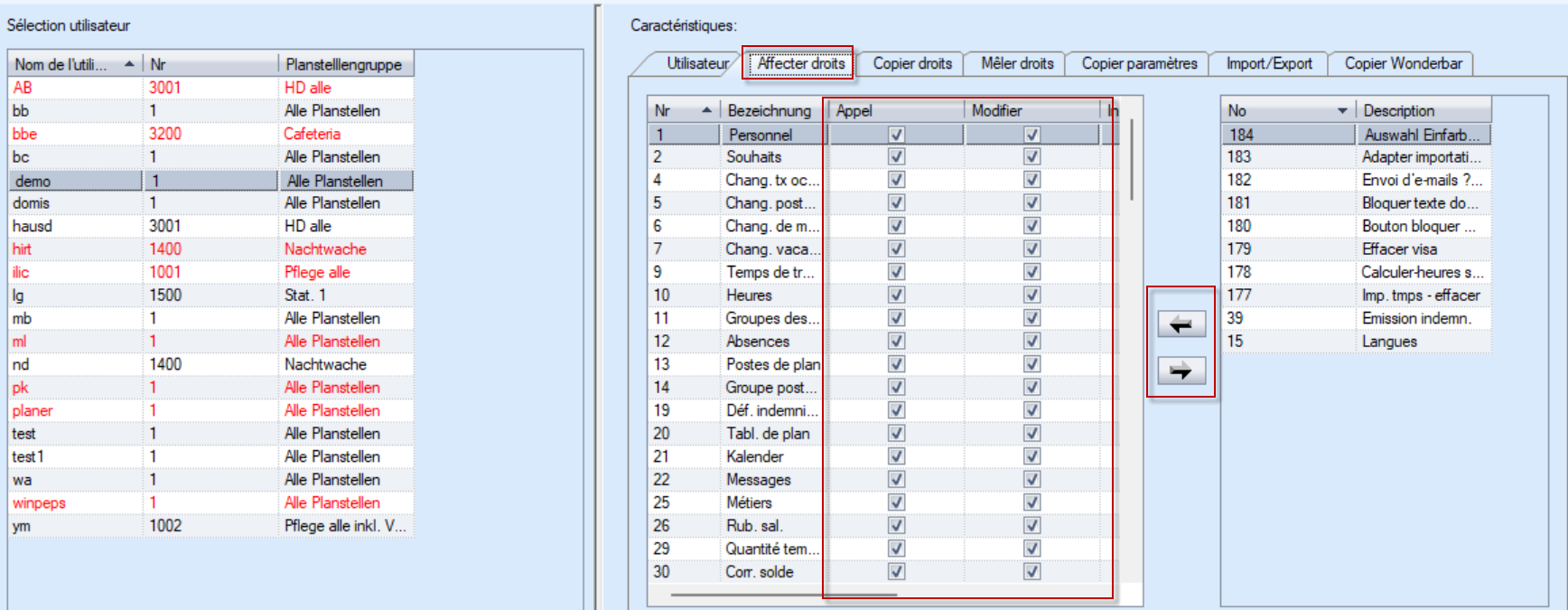 Dans la liste de sélection, les droits correspondants peuvent être attribués à l'utilisateur sélectionné à l'aide de la flèche vers la gauche ou supprimés à l'aide de la flèche vers la droite.