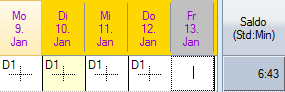 Bei diesem Beispiel wurden von Montag bis Mittwoch Dienstfrei geplant, dies reduziert den Saldo täglich um die Sollzeit des Mitarbeiters 6:43 Std. und ergibt somit am Mittwoch -20:09 Std.