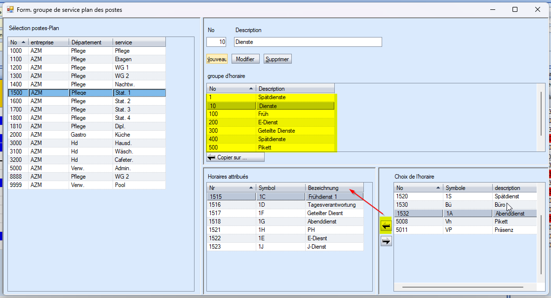 Une fois le groupe de services créé, vous pouvez sélectionner les services correspondants dans la liste des services et les attribuer au groupe (flèche vers la gauche).