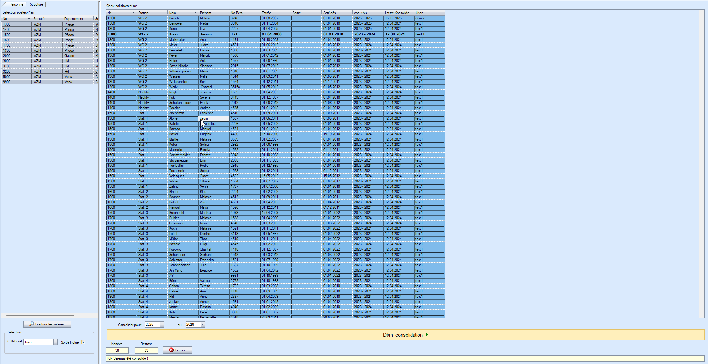 Avant la consolidation, tous les tableaux de planification/plannings de service et plannings de service annuels doivent être clôturés. S'il existe des tableaux de planification/plannings de service ou des plannings de service annuels ouverts, les collaborateurs concernés ne peuvent pas être consolidés.