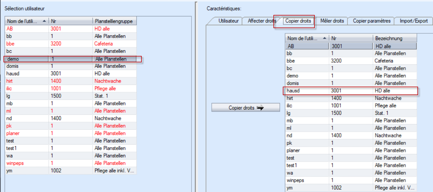 Si plusieurs utilisateurs disposent des mêmes autorisations pour la planification du personnel, celles-ci peuvent être transférées d'un utilisateur existant à un, plusieurs ou de nouveaux utilisateurs sous l'onglet « Copier les droits »