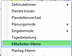 Klicken Sie mit der rechten Maustaste in der Plantafel auf den Mitarbeiter-Namen und Tag für den Sie ein Memo erstellen möchten und klicken Sie in der Dialogbox auf Mitarbeiter-Memo.