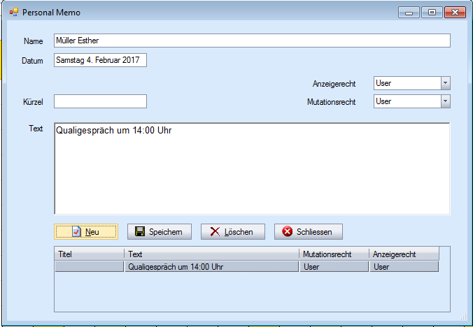 Die Auswahl „User" bedeutet, dass nur der Erfasser des Memos bearbeiten oder sehen kann.