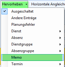 Wenn Sie in der Plantafel unter „Hervorheben _Memo" klicken werden die Tage an dem Memo-Eintrage farbig.
