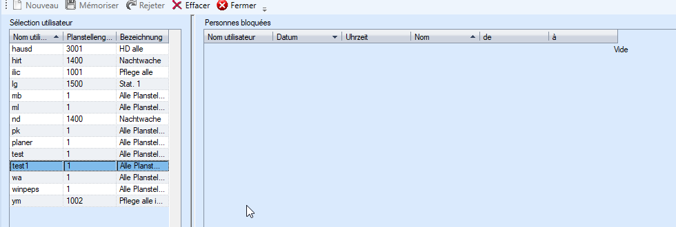 - Cliquez sur « Actualiser » pour réinterroger et actualiser la liste. S'il reste encore des utilisateurs marqués en rouge, vérifiez si l'utilisateur ne travaille vraiment plus dans PEPS. Si c'est le cas, vous pouvez sélectionner toutes les personnes bloquées dans la liste à l'aide de la souris + Shift.