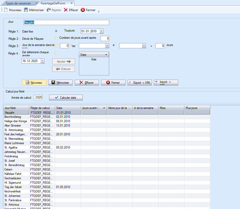 L'outil « Définitions des jours fériés » vous permet d'enregistrer les jours fériés avec la règle correspondante. Cela présente l'avantage de ne pas avoir à saisir les jours fériés chaque année. Les jours fériés religieux tels que le carnaval, le Vendredi saint, le lundi de Pâques, etc. peuvent être dérivés de Pâques.