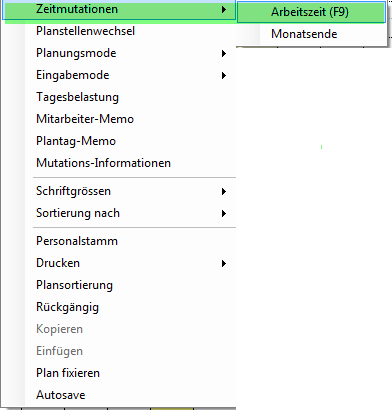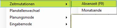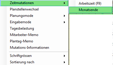 Setzen Sie den Fokus ins Planungsfeld des gewünschten Monats und des betreffenden Mitarbeiters. Mit der rechten Maustaste wählen Sie „Zeitmutation" / „Monatsende" aus.