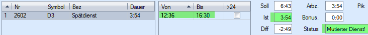 Die veränderte Dienstzeit in unserem Bei-spiel reduziert den Saldo um 3:54 Std.