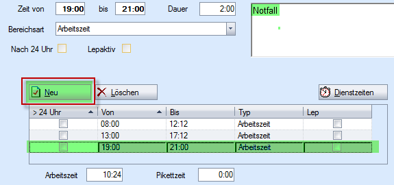 Zusätzliche Zeiten müssen nach der Eingabe mit der Taste „Neu" erfasst werden und mit der Taste „Übernehmen" in die Planung übernommen werden.