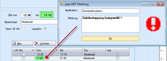 Wenn sich Zeiten überschneiden erhalten Sie die Meldung „Zeitüberlappung"