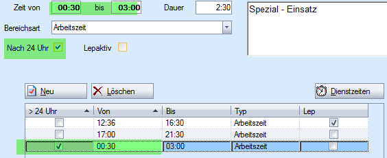 Hat ein Dienst einen Zeitunterbruch mit Anfang „nach Mitternacht" muss diese Option aktiviert werden, damit die Zeiten korrekt berechnet und die betreffende Zulagenzeit berücksichtigt wird!