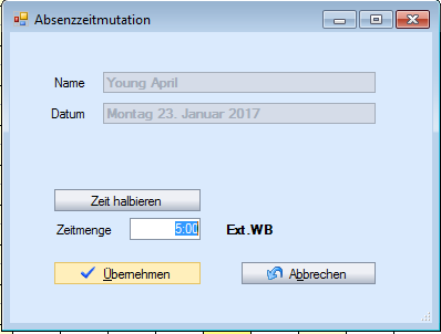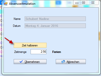 Wenn nur eine halbe Absenz/Abwesenheit geplant werden soll wie halbe Feiertage kann die geplante Absenz/Abwesenheit mittels Mutation halbiert werden