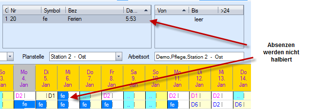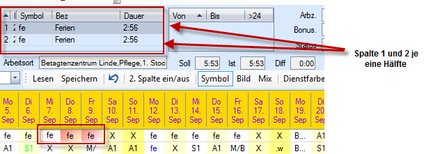 In den Vorgänger Versionen wurden Absenzen/Abwesenheiten bei geschlossener Spalte 2 jeweils halbiert und je eine Hälfte in Spalte 1 und Spalte 2 geplant.