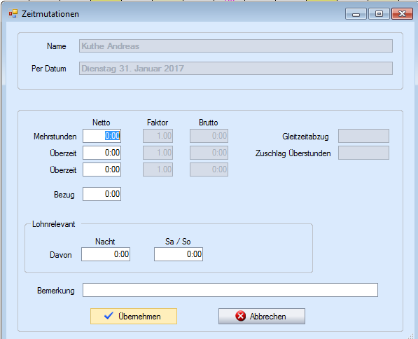 Setzen Sie den Fokus auf den zu ändernden Dienst und drücken Sie danach die rechte Maustaste. Im Menü wählen Sie „Zeitmutation" „Arbeitszeit" dies öffnet den Dialog Mutation Arbeitszeit.