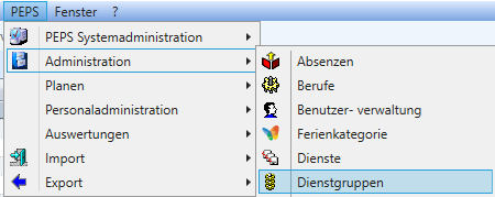 In der Menüleiste unter PEPS / Administration / Dienstgruppen gelangen Sie zum Dialog der Dienstgruppen.