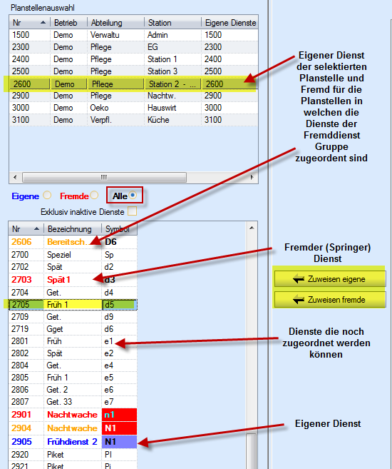 Möchte man die Funktion der Austauschbaren Dienste nutzen, werden alle Dienste eines Bereiches (z.B. Pflege) einer „Fremddienstgruppe" zugeordnet.