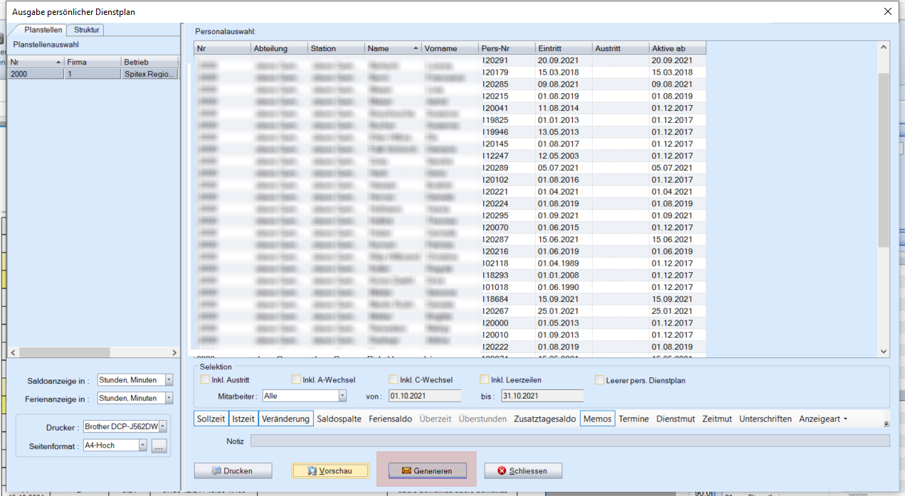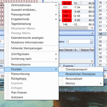 Im Dienstplan rechte Maustaste drücke. Unter Drucken kann der Persönliche Dienstplan, Dienstplanrapport, das Personalblatt oder Memos versendet werden.