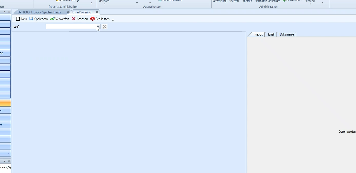 Hier kann der gewünschte, im vornherein aufbereitete Email Lauf ausgewählt werden. Auf der linken Seite sehen Sie denn Rapport, die Email und die angehängten Dokumente.