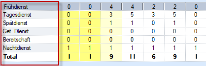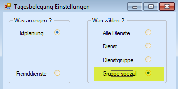 Mit der Einstellung „Gruppe Spezial" werden pro Tagesbelegungszeile die Dienste, welche den entsprechenden Dienstgruppen zugeteilt sind, gezählt.