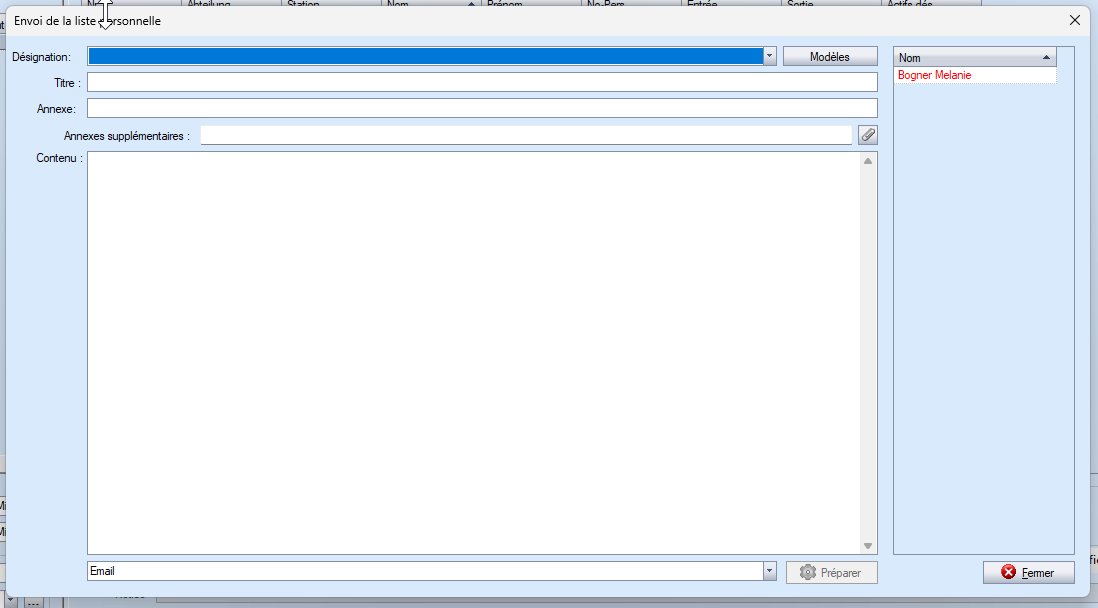 Vous pouvez ici sélectionner le modèle d'e-mail souhaité, préparé au préalable. Sur le côté gauche, vous voyez le rapport, l'e-mail et les documents joints.