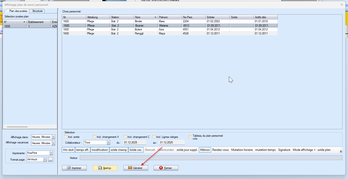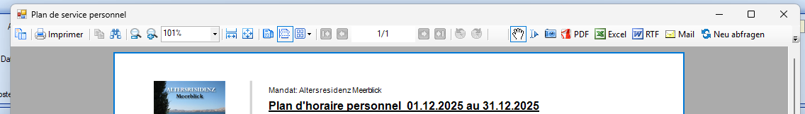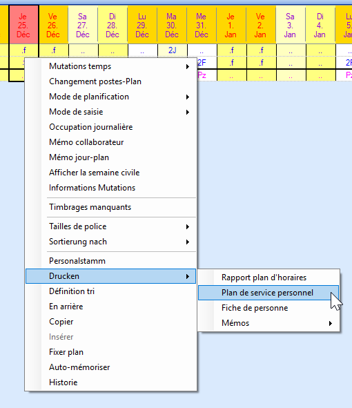 Cliquez avec le bouton droit de la souris sur le planning. Sous Imprimer, vous pouvez envoyer le planning personnel, le rapport de planning, la fiche du personnel ou des mémos.