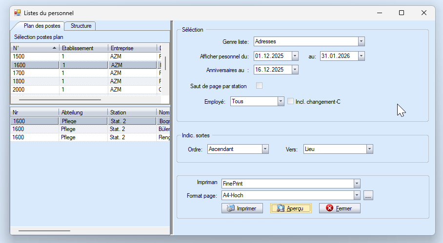 Dans la case de sélection « Type de liste » en haut à droite, vous pouvez choisir entre les listes Adresses, Anniversaires, Ancienneté, Âge, Liste téléphonique, Entrées et Sorties. En haut à gauche, vous voyez la liste des postes.