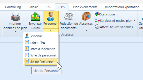 Sous « PEPS_Auswertung_Personal » (Évaluation PEPS_Personnel), vous pouvez imprimer une liste du personnel.