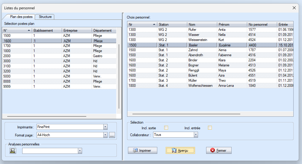Dans le champ « Selektion » (Sélection), vous pouvez choisir si vous souhaitez créer une liste de tous les employés, uniquement des salariés mensuels ou uniquement des salariés horaires, et inclure les départs ou les arrivées. En haut à gauche, vous trouverez à nouveau la sélection des postes. Vous pouvez y sélectionner le poste pour lequel vous souhaitez créer une liste du personnel.