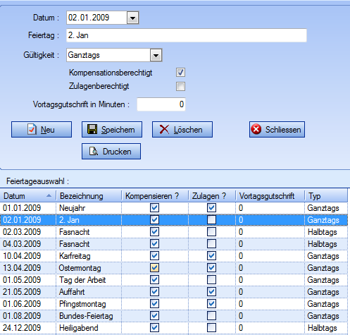 Mit „Neu" übernehmen Sie einen neu erstellten Feiertag, mit „Speichern" speichern Sie einen geänderten Feiertag, mit „Löschen" entfernen Sie einen bestehenden Feiertag, mit „Drucken" können Sie Ihre Feiertagsliste ausdrucken und „Schliessen" schliesst das Fenster.