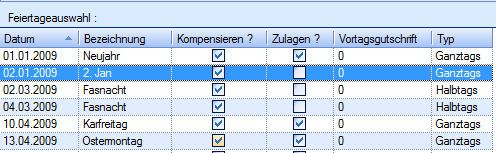 Hier geben Sie das Datum des Feiertages ein. In diesem Feld können Sie die genaue Bezeichnung des Feiertages eingeben. Unter „Gültigkeit geben Sie an ob der Feiertag den ganzen Tag oder den halben Tag Gültigkeit hat Hier legen Sie fest ob der Feiertag Kompensations- bzw. Zulagenberichtigt ist An einigen Orten ist die Arbeitszeit am Tag vor dem Feiertag reduziert. Hier können Sie die Reduktion in Minuten eingeben. Dies wird im Planungsprogramm berücksichtigt. Im unteren Teil der Maske werden Ihnen die erfassten Feiertage angezeigt. Für das neue Jahr können Sie einen bestehenden Feiertag in der Liste auswählen, unter „Datum" das neue Datum eingeben und mit „Neu" den Feiertag hinzufügen.