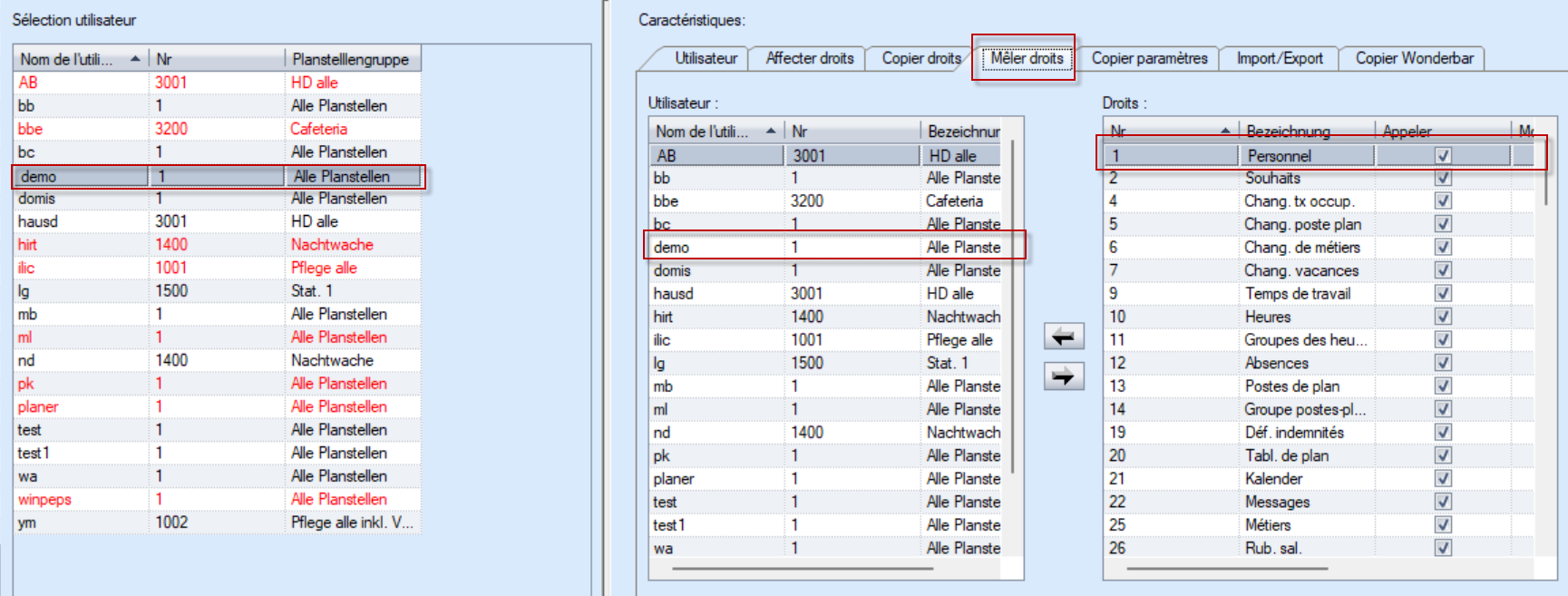 En cliquant sur la flèche vers la gauche, vous transférez les droits sélectionnés aux utilisateurs sélectionnés.