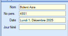 Le jour de la semaine et la date, ainsi que les jours fériés, sont indiqués dans le champ Date ou Jours fériés..