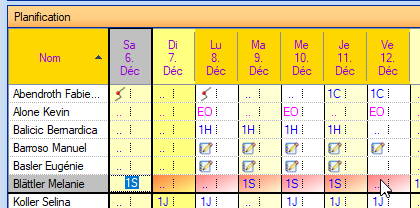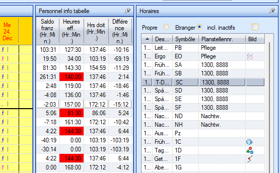 Sur le côté droit du tableau de planification, vous voyez la liste des services ou des absences. Vous avez la possibilité de sélectionner un domaine de planification spécifique pour un collaborateur et de le remplir par glisser-déposer.