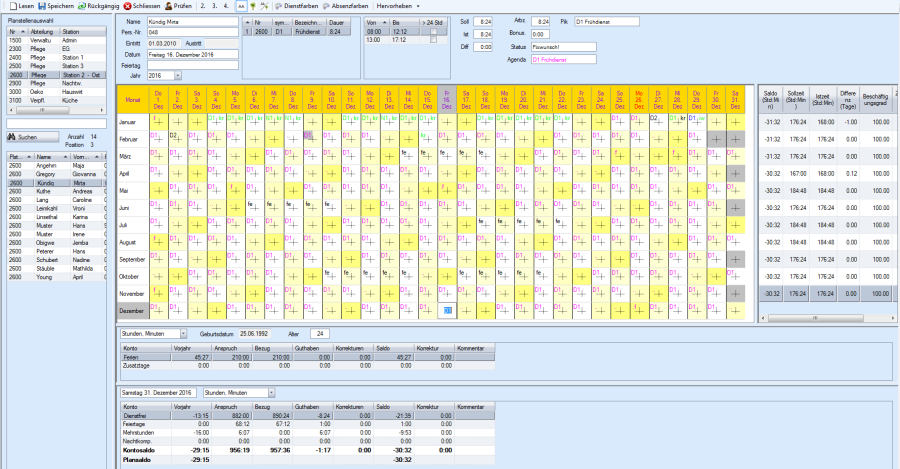 Es ist auch möglich in der Jahresplantafel zu Planen. In der Jahresplantafel hat man den Überblick über die Jahresplanung eines/r Mitarbeiter/in inkl. der verschiedenen Zeitkonten. Es kann auf die gleiche Art geplant und mutiert werden wie im Monatsplan.