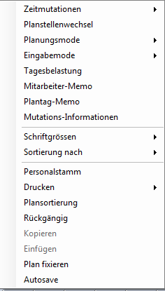 Wenn Sie in der Plantafel die rechte Maustaste drücken erscheint folgende Auswahlliste: