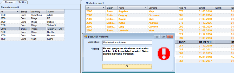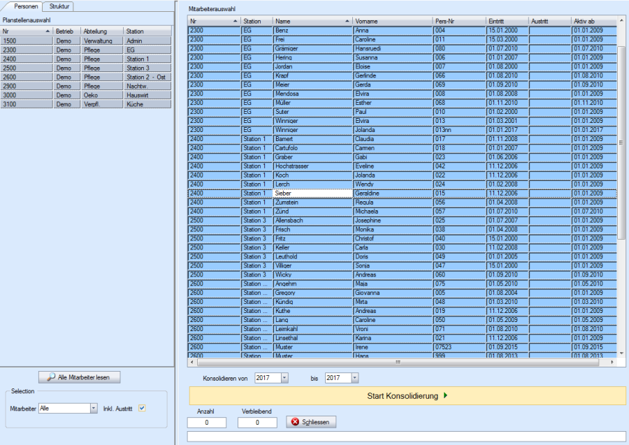 Wählen Sie im Linken Feld die gewünschten Stationen mit „ctrl" und „C" aus Und im Rechten Feld die Mitarbeiter/Innen die konsolidiert werden sollen aus.