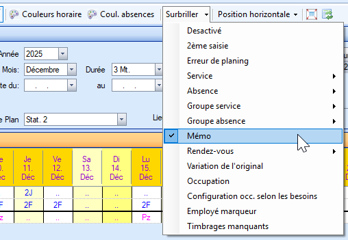Si vous cliquez sur « Mettre en évidence _Mémo » dans le tableau de planification, les jours auxquels des mémos ont été ajoutés apparaissent en couleur.