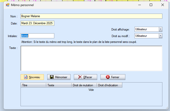 Sous Date, indiquez le jour pour lequel vous souhaitez créer le mémo. Sous Abréviation, vous pouvez saisir vos initiales. Écrivez votre texte dans le champ de texte.