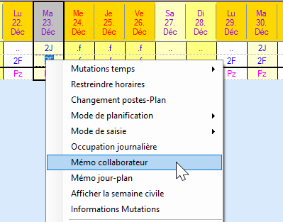 Cliquez avec le bouton droit de la souris dans le tableau de planification sur le nom de l'employé et le jour pour lesquels vous souhaitez créer un mémo, puis cliquez sur Mémo de l'employé dans la boîte de dialogue.