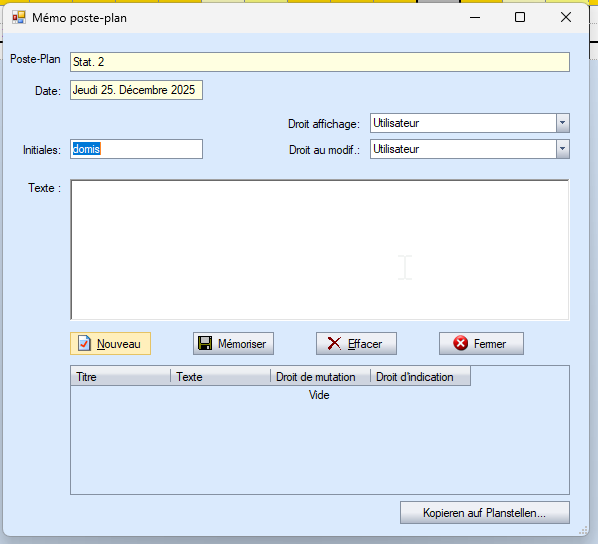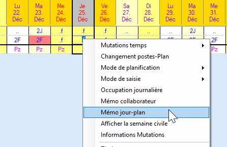 Cliquez avec le bouton droit de la souris dans le tableau de planification sur le jour pour lequel vous souhaitez créer un mémo, puis cliquez sur Mémo de planification dans la boîte de dialogue.