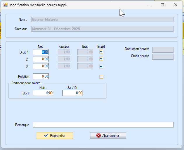 Les heures effectives du solde sont saisies dans le champ Heures supplémentaires.