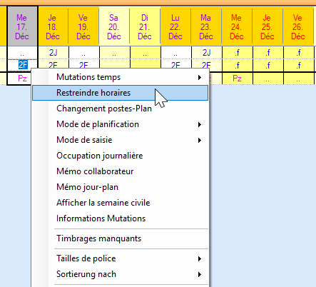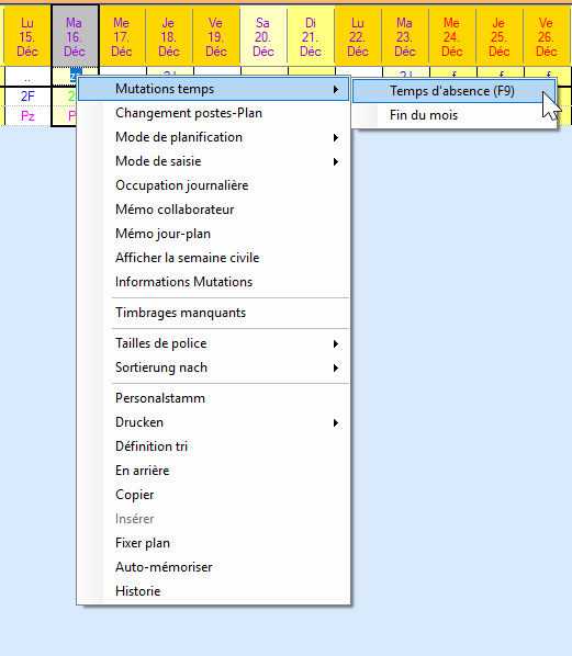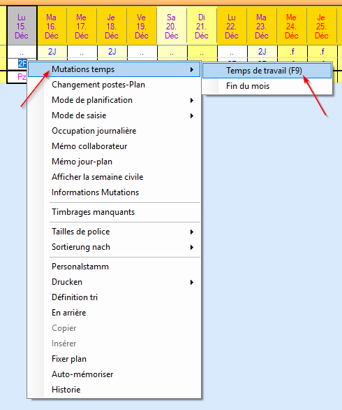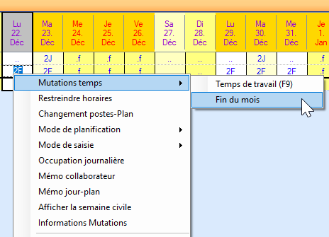 Placez le curseur dans le champ de planification du mois souhaité et du collaborateur concerné. Avec le bouton droit de la souris, sélectionnez « Modification des temps » / « Fin du mois ».