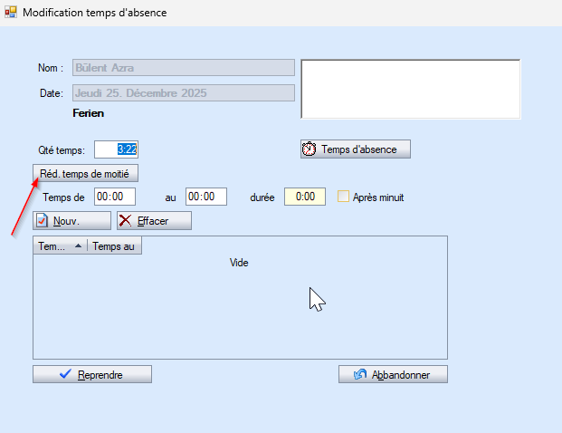 Si seule une demi-absence doit être planifiée, comme pour les demi-jours fériés, l'absence planifiée peut être divisée par deux à l'aide d'une mutation.