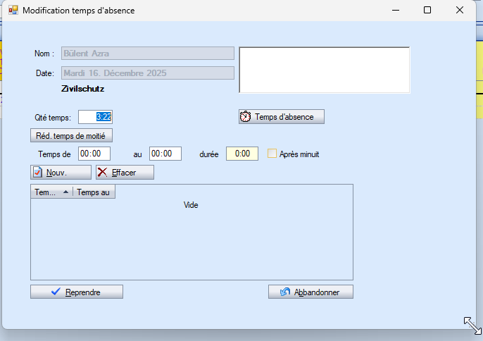 Sélectionnez l'absence à modifier, puis cliquez avec le bouton droit de la souris. Dans le menu, sélectionnez « Modification horaire » _« Temps d'absence » pour ouvrir la boîte de dialogue Modification du temps d'absence