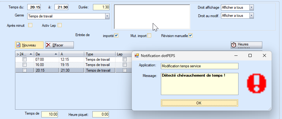 Si les horaires se chevauchent, vous recevrez le message « Chevauchement horaire ».