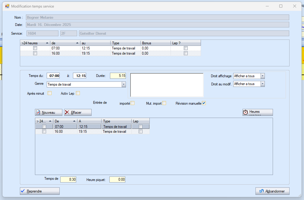 Sélectionnez le service à modifier, puis cliquez avec le bouton droit de la souris. Dans le menu, sélectionnez « Modification horaire » « Temps de travail » pour ouvrir la boîte de dialogue Modification du temps de travail.
