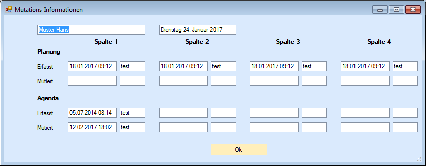 In diesem Beispiel ist ersichtlich das der User „test" am 18.01.2017 um 9:12 Uhr die Planungen für die Spalten 1-4 erfasst hat. Im Feld Agenda ist ersichtlich das der User Test am 05.07.2014 ursprünglich in der Agende die erste Spalte geplant hat und diesen Eintrag zuletzt vom selben User am 12.02.2017 mutiert wurde.