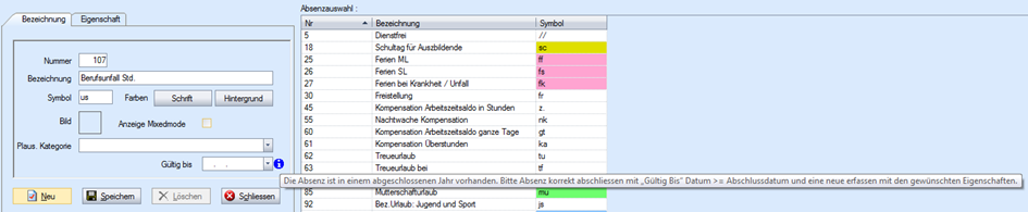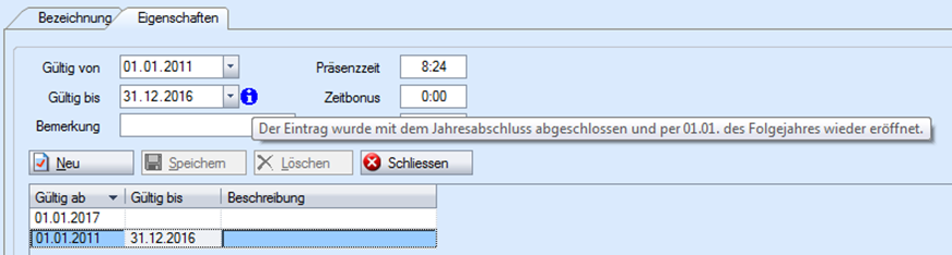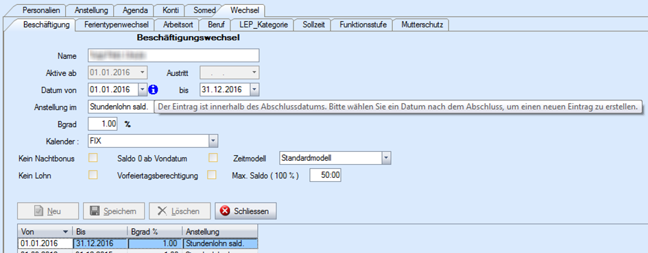 Nach erfolgtem Jahresabschluss werden in den Stammdaten und im Personalstamm die Saldorelevanten zeitabhängigen Daten wie folgt angezeigt und eine Mutation oder Löschung ist nicht mehr möglich: